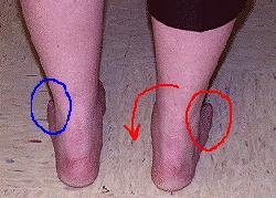 Figure 1: In this figure, the left side is normal and the right side (red markings) is abnormal. As viewed from the backside, the inside of the right ankle (medial side) appears to roll toward the opposite ankle (red arrow). At the same time, both the 4th and 5th toes may be seen on the right (red circle), while only the 5th toe may be seen on the left foot (blue circle).