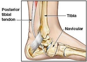 The posterior tibial tendon is essential to the normal functioning of the foot by maintaining the navicular bone in the proper position. By doing so, the arch of the foot is maintained. However, if the posterior tibial tendon fails to function properly, the navicular bone begins to drop, the arch falls and a flatfoot deformity begins to develop. When this occurs, the foot may develop pain with weight bearing.