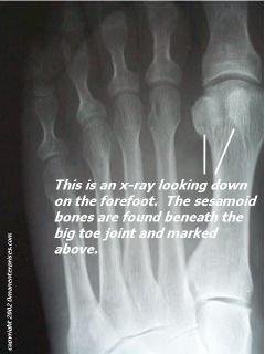During the examination, the physician will look for tenderness at the sesamoid bones. Your doctor may manipulate the bone slightly or ask you to bend and straighten the toe. He or she may also bend the great toe up toward the top of the foot to see if the pain intensifies. Your physician will request X-rays of the forefoot to ensure a proper diagnosis. If the X-rays appear normal, the physician may request a bone scan.