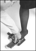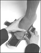 Have the customer remove their footwear and stand, placing their right heel into the right heel cup. The customer should stand with equal weight on both feet to ensure that the foot being measured has elongated and spread to it's maximum size. Be sure the heel is properly located against the back of the heel cup, by grasping the customer's ankle and device together, as illustrated in photo. |
