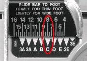 Slide the width bar firmly to the edge of the foot. Locate the shoe size (as determined in step four) on the movable width bar and view the width measurement indicated by the properly determined shoe size. If the shoe size falls between widths, choose a wider width for a thick foot, a narrower width for a thin foot. |