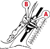 Place your thumb on the ball joint of the foot (as shown in the photo to the right). Slide the pointer (A on diagram) forward so the inside curve of the pointer fits the ball joint of the foot and the two high ribs come in contact with your thumb. When the pointer is properly located, the lower middle rib will be against the ball joint on the side of the foot (B on diagram). This yields the arch measurement. The arch length represented in the diagram is 8 1/2. |