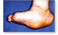 Charcot Foot is a pattern of bone and joint destruction that can lead to severe foot deformities. This disease usually begins with peripheral neuropathy (decreased feeling in the feet) and decreased blood circulation, most commonly seen in diabetics. People with decreased nerve sensation may injure their feet, producing small fractures in the bones; and because they have decreased feeling, they may have minimal or no pain, and they continue walking on the foot. This combined with the lack of ability to heal by having limited circulation weakens the supporting structures of the foot and eventually result in the deformity.