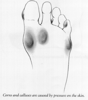 Actually, most foot problems can be blamed not on walking but on your walking shoes. Corns, for example, are calluses that form on the toes because the bones push up against the shoe and put pressure on the skin. The surface layer of the skin thickens and builds up, irritating the tissues underneath. Hard corns are usually located on the top of the toe or on the side of the small toe. Soft corns resemble open sores and develop between the toes as they rub against each other.
