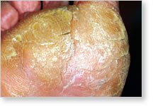 Note the thickened skin on the bottom of the foot. This can lead to cracks and an infection in the foot. The thick-scaled skin is aggravated by the condition of neuropathy. |