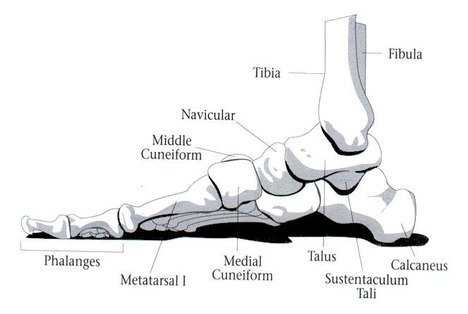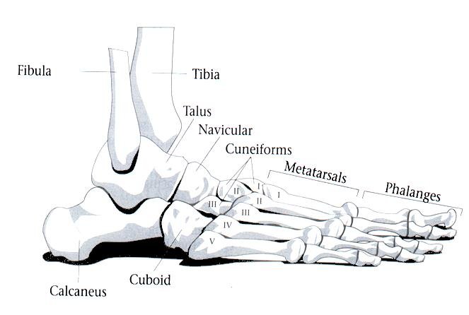 Here are some facts from the American Academy of Orthopaedic Surgeons: Each foot has 26 bones. The ankle bone (talus) and the ends of the two lower leg bones (tibia and fibula) form the ankle joint, which is stabilized and supported by three groups of ligaments. Muscles and tendons move the foot and ankle.