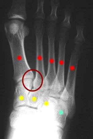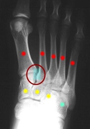 Figure 1: Normal AP xray of right foot. The yellow dots are the cuneiform bones (3). The red dots are the metatarsals (5). The teal dot is the cuboid bone. The red circle represents tthe Lisfranc joint between the 1st and 2nd metatarsals and the medial cuneiform bone.