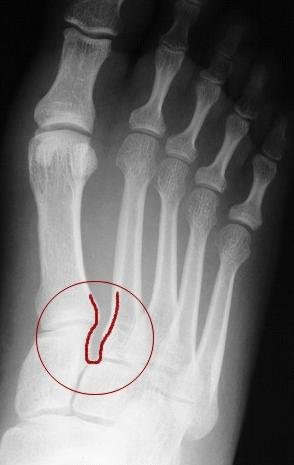 abnormally large space (outlined by red line) between the two metatarsal bones