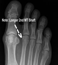 Morton's foot is characterized by the second toe being longer than the big toe. The problem is that the bone behind the big toe (first metatarsal) is too short. This inherited trait occurs in about 25 percent of the population.
