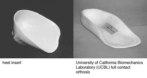 No device needed if there are no symptoms or pain. If there is pain or aching, a semirigid insert or long arch pad, inner heel wedge or extended heel counter may help. |